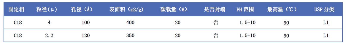 采用独特键合技术,将直链 C18直接独立的双位点键合于Si-H键上直接形成Si-C键的C18键合相。增加了稳定性与寿命。