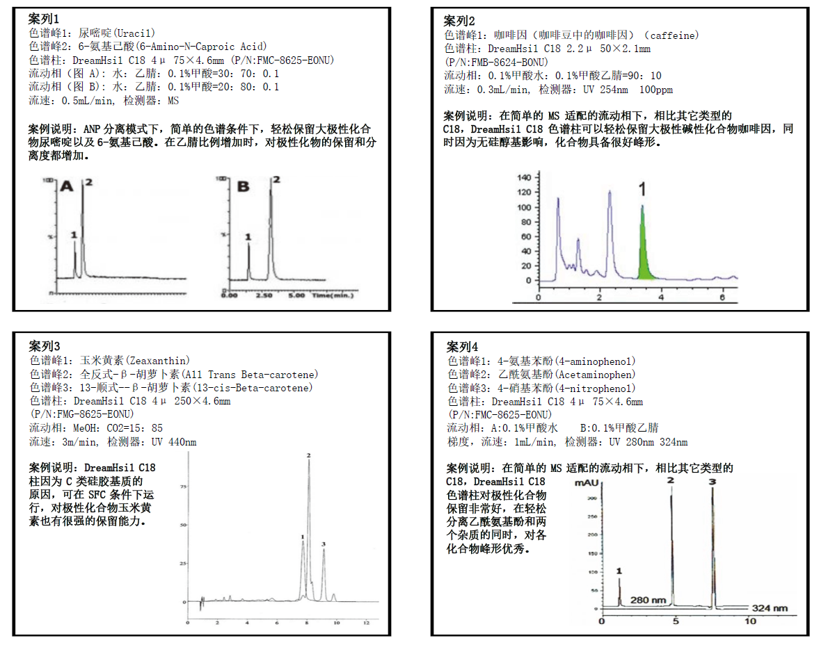此固定相可以在100%水相和100%有机相下使用。它最大的用途是在反相模式下。该固定相是疏水性很强的固定相,相比一般的B类硅胶C18,有更强的疏水分离能力。 当它在高水或纯水条件下使用时,对极性的酸、碱化合物有很好的选择性,并不需要在此柱上采用 ANP 模式。 此固定相可承受各种溶剂在流动相中的添加,不易被离子对改性。 DreamHsil C18可以作为实验室的强有力工具因为它相比B 类的 C18 更稳定更耐用。它归属于USP L1 的分类。可以用于取代那些在其它类型C18 上,方法不稳定,含离子对试剂方法的应用。